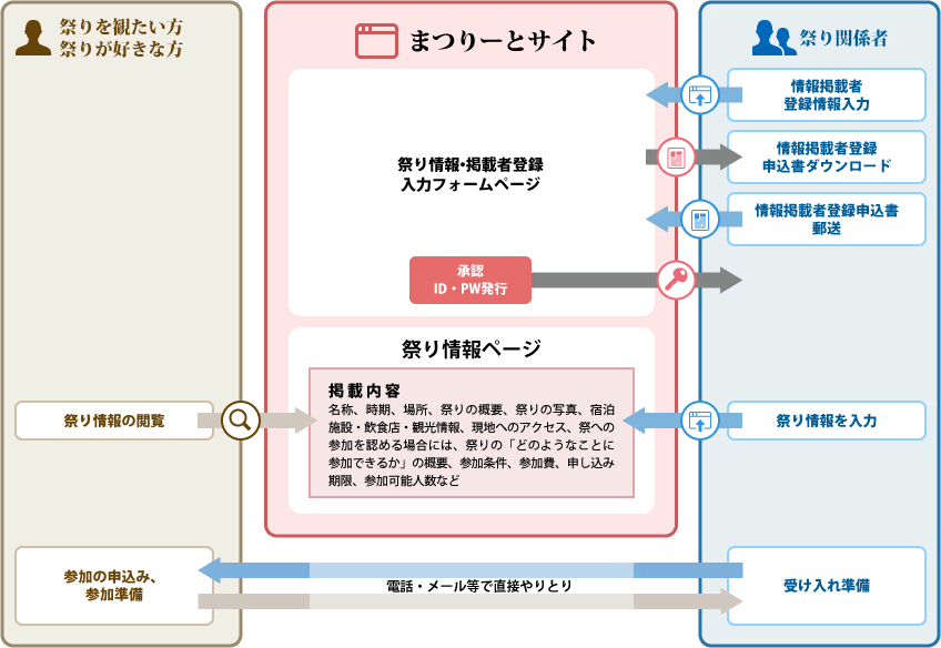 祭りの主催者等の関係者の皆さんは、まつりーとサイトに登録していただくと、祭りを全国に広く周知し、祭りを観たいと思う方々や祭り好きな方々を誘致するため、まつりーとサイトに祭りの情報や、祭りへの一般の方々の参加を認める場合の参加希望者の募集情報、周辺観光情報等の関連情報を掲載することができ、いつでも更新することができます。